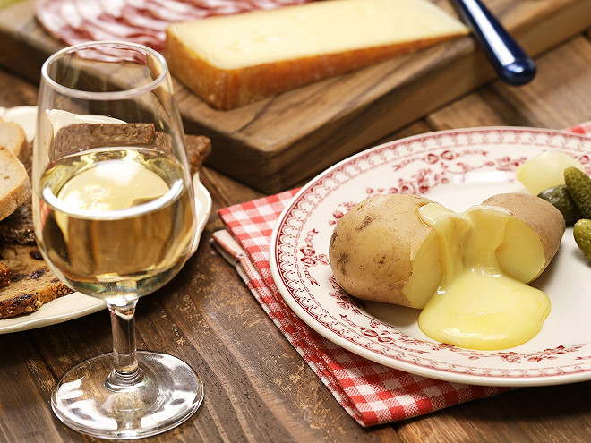 Vin chaud et apéritif d'accueil, bar à raclette, dessert, vin blanc de Savoie et rouge